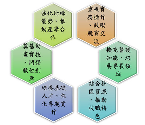 四、擴充醫護相關知能,培養專長領域:本校護理起家並轉型而成多元科系,然近三分之一師生均與醫護領域相關,浸淫其中,學生對於醫護領域知識的興趣及接受度較一般學生高,97年專科評鑑過程,評鑑委員也期許本科可以重視醫護影視發展。為強化學生跨領域能力,本科自99學年度入學學生課程即新增「醫護節目製作」必修課程,100學年度起入學生並增設必修「健康服務模組」課程共計8學分,分別是專業通識課程中增設「健康維護」及「危及救護」,及校定必修課程中增設「健護動畫設計」及「醫護節目製作」。在師資方面除了教師具相關專長並以多項相關作品獲選全國獎項(兩項教育館影片徵集入選獎、1項新聞局優良頻道佳作獎、1項金鐘獎入圍)。100學年度本科學生並與本校護理科學生合作參加「2012第三屆全國技專院校護理實務能力競賽」獲得「英文護理情境對話MV」第一、二名暨最佳人氣獎。